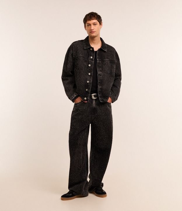 Calça masculina confeccionada em jeans mais sustentável com boas práticas ambientais, no modelo super baggy. Possui cós com passante, fechamento tradicional, bolsos e puídos.