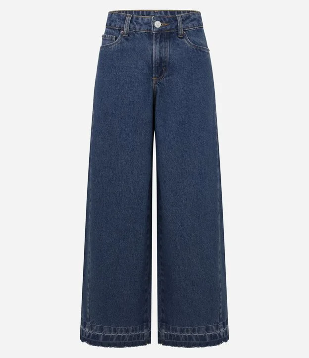 Calça Super Wide em Jeans com Cintura Média e Barra Desfeita Azul Escuro