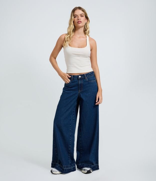 Calça Super Wide em Jeans com Cintura Média e Barra Desfeita Azul Escuro