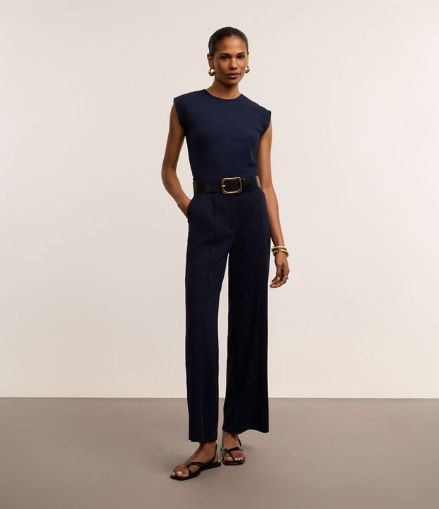 Calça Wide Cintura Baixa em Crepe com Frisos Azul Marinho