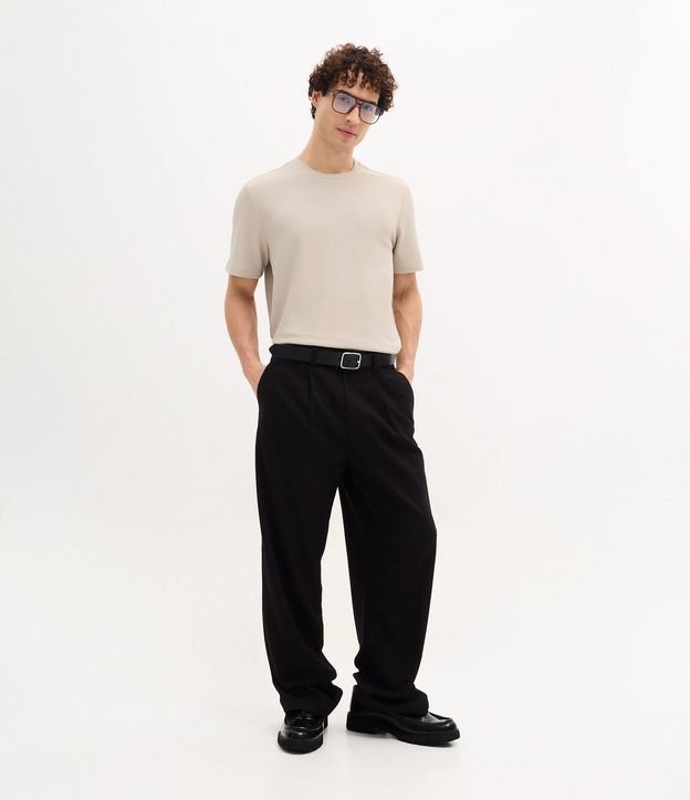 Calça masculina confeccionada em poliéster, no modelo wide leg. Possui cós com passante, fechamento invisível, bolsos, frisos e alfaiatada.