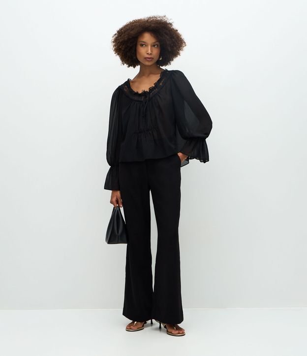 Calça Wide Leg Alfaiatada em Crepe com Botão Preto