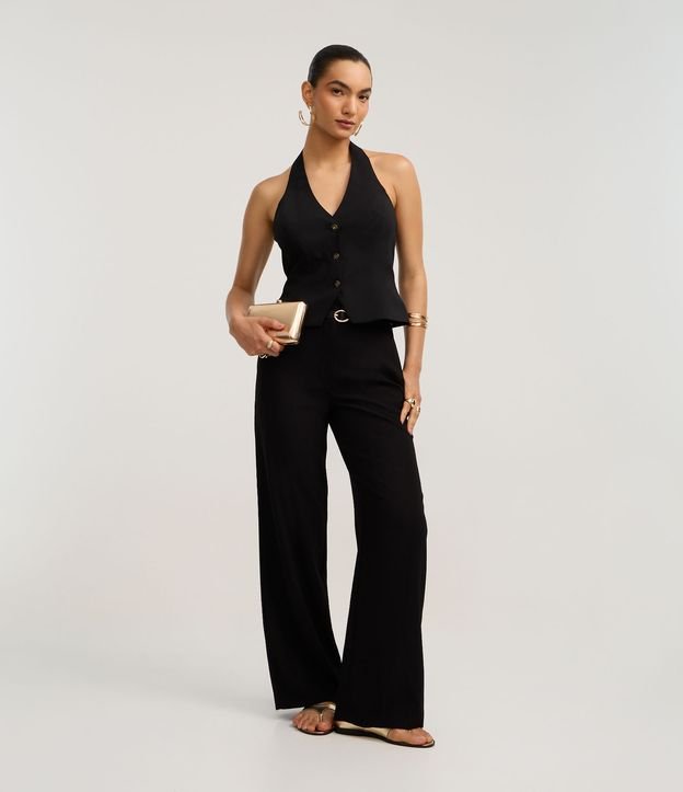 Calça wide leg alfaiatada, confeccionada em crepe, com cintura alta, passantes no cós e fechamento tradicional. Inclui cinto fino de PU.