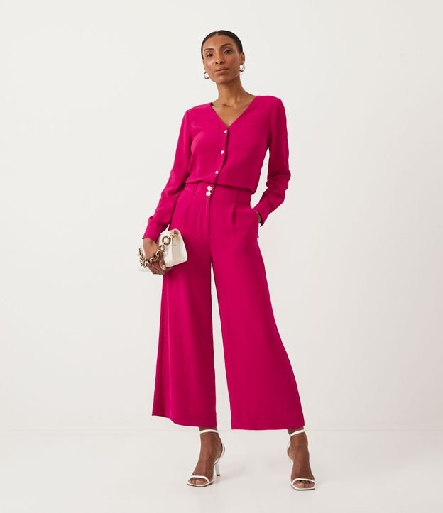 Calça Wide Leg com Tecido Texturizado e Fechamento em Botões