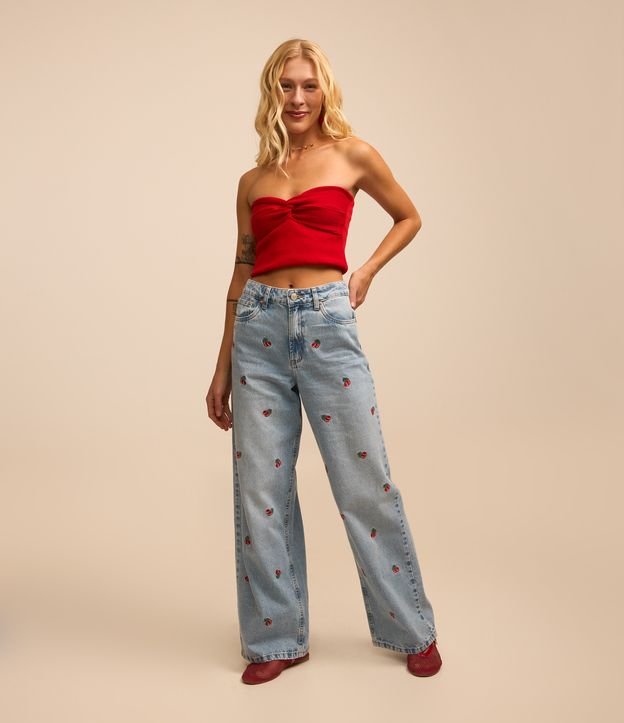 Calça Wide Leg em Jeans com Bordado de Cerejinhas