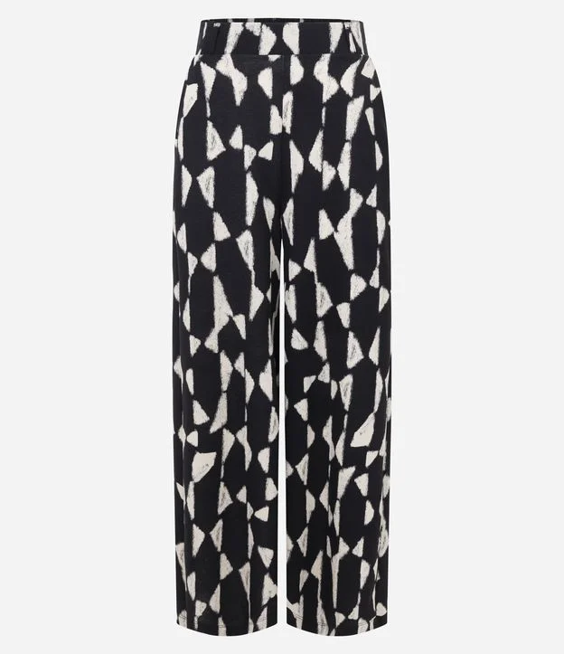 Calça Wide Leg em Piquet com Estampa Abstrata Preto