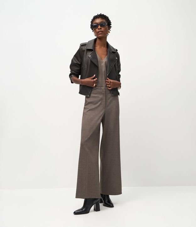 Calça Wide Leg em Ponto Roma com Estampa Xadrez Cinza