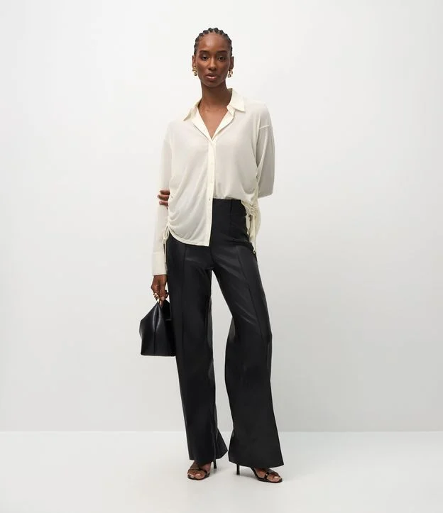 Calça feminina em PU com modelagem wide leg. Possui cós com passantes, fechamento frontal discreto, bolsos traseiros aplicados, criando visual moderno. Combina com ocasiões urbanas, trabalho casual, produções noturnas e eventos informais.