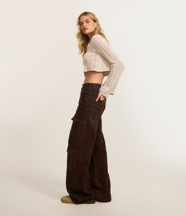 Calça Wide Leg em Sarja com Cintura Alta e Bolsos Cargo Marrom