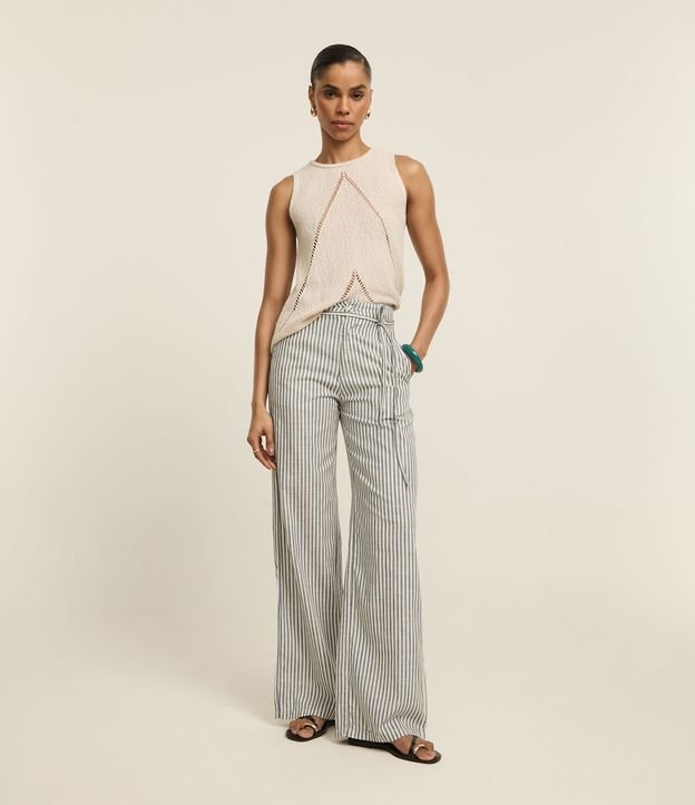 Calça Wide Leg em Sarja com Listras e Cinto Fino Azul