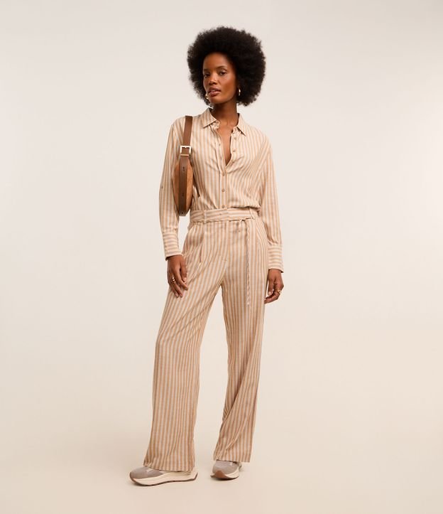 Calça wide leg de cintura alta, confeccionado em viscolinho com viscose mais sustentável, com passantes no cós. A calça tem cinto corda de tecido, além de listras verticais.