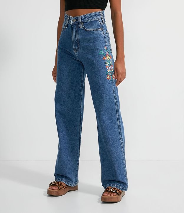 Calça Wide Leg Jeans com Bordado Floral nas Laterais