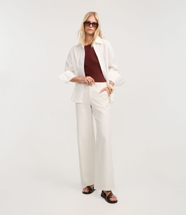 Calça Wide Leg Listrada em Sarja com Bolsos Off White