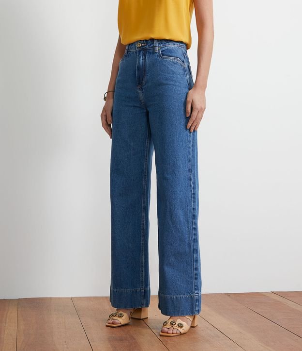 Calça Wide Leg Jeans com Bordado no Bolso Traseiro