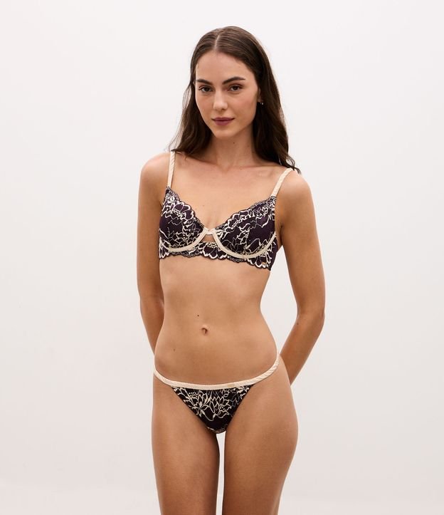 Calcinha String Fio em Renda Floral Bicolor Roxo/Bege