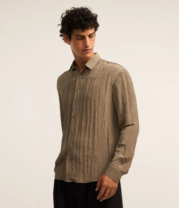 Camisa de mangas longas confeccionada em tecido plano. Conta com efeito acetinado além de tecido todo texturizado com aspecto amassado semelhante ao airflow, conferindo um estilo urbano muito arrojado a quem veste esta peça.