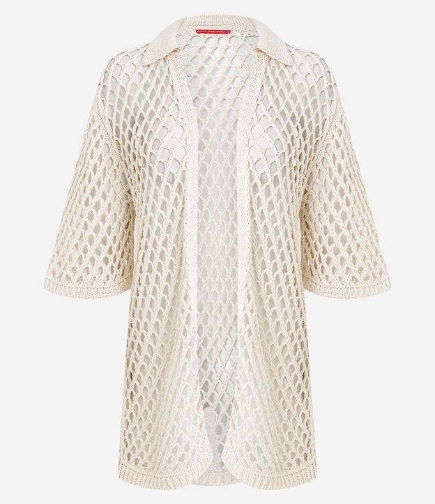 Camisa feminina confeccionada em algodão certificado BCI. Possui trama aberta estilo crochê, com padrão de laçadas ovais que criam efeito de rede. Possui comprimento alongado e modelagem solta. As mangas são médias e amplas,, gola dobrada, totalmente vazada, é ideal para sobreposição em looks de verão ou praia.