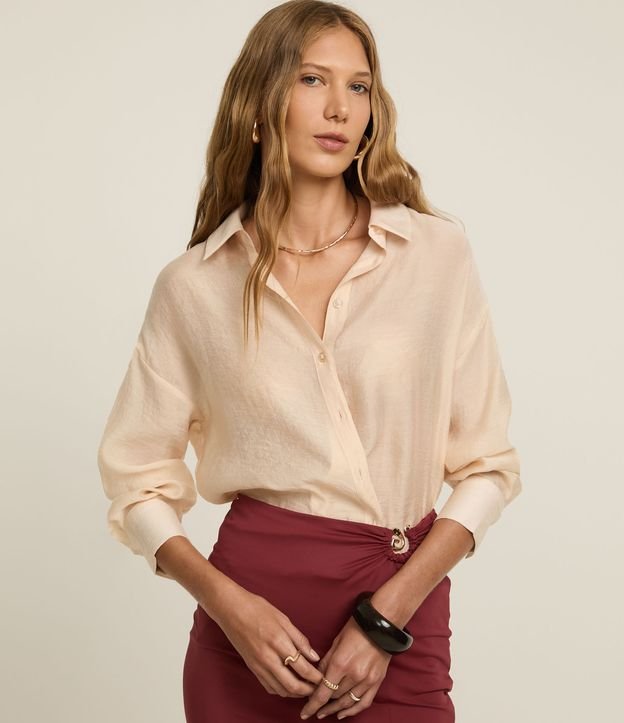 Camisa Alongada em Liocel com Cava Deslocada e Punho Largo Champanhe Rosé