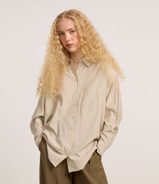 Camisa alongada confeccionada em tricoline com algodão bci mais sustentável, cava deslocada, listrada e com abotoamento frontal.