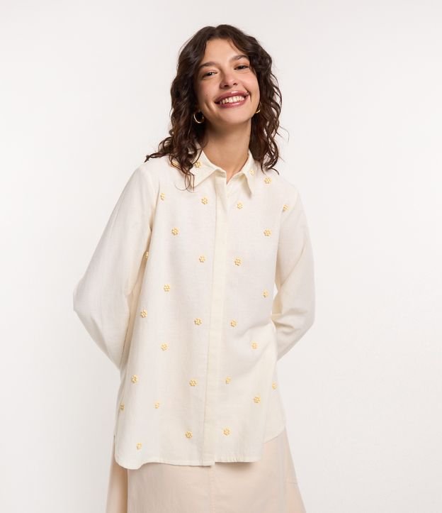 Camisa Alongada em Viscose com Linho e Bordado de Miçangas