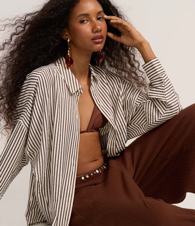 • Camisa Amassadinha com Esta de Listras e Texturizada Marrom 6