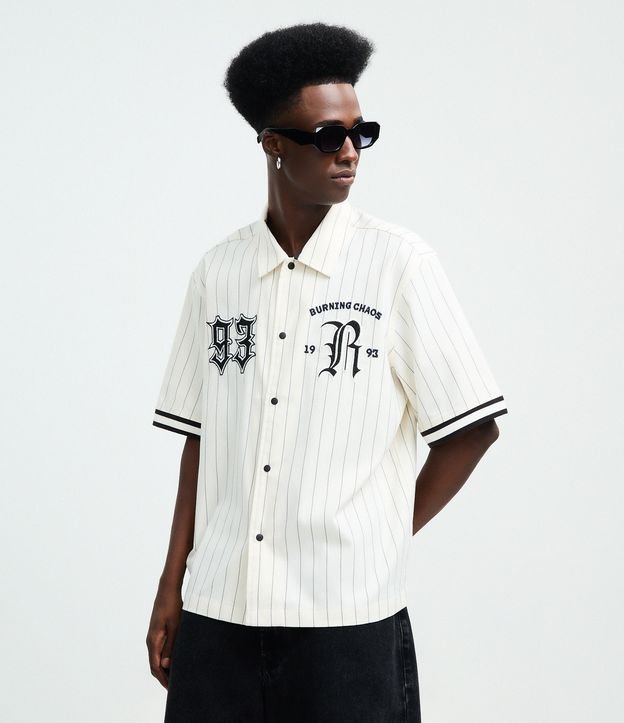 • Camisa Baseball Listrada em Microfibra com Lettering Reckless Branco 1