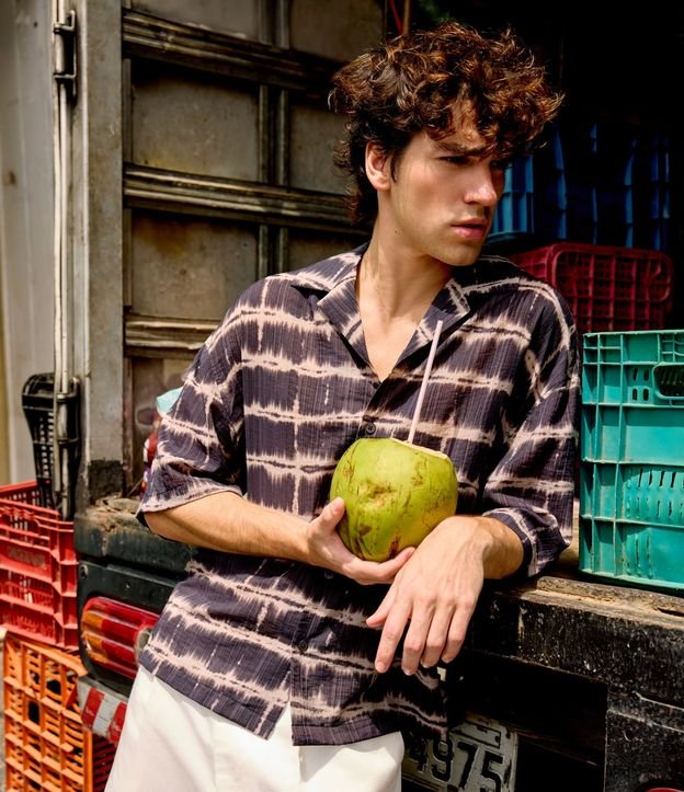 Camisa masculina confeccionada em chiffon, no modelo boxy. Possui gola lapela, manga curta, abotoamento frontal, estampa tie dye e textura bowling.