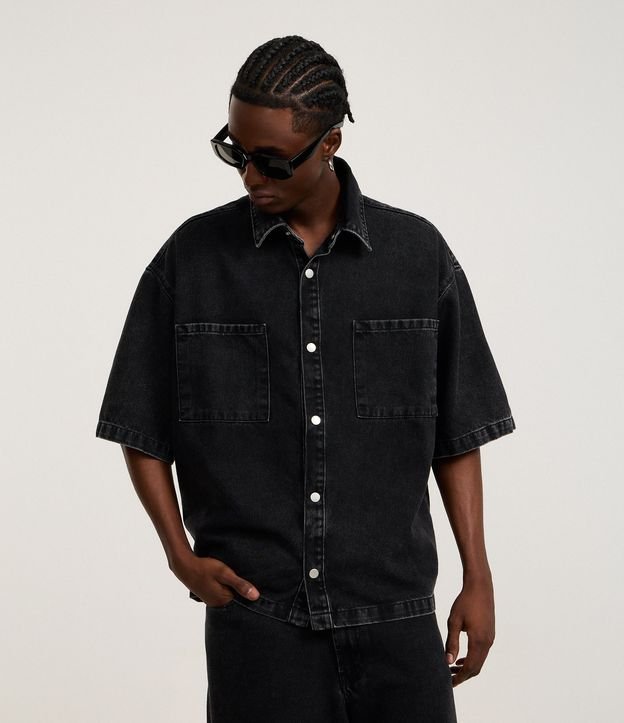 Camisa Boxy em Jeans com Bolsos Marmorizada Preto