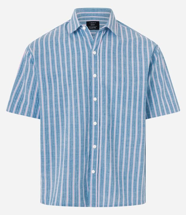 Camisa masculina confeccionada em algodão mais sustentável, gola colarinho, abotoamento frontal, manga curta. Peça no modelo boxy com estampa listrada.