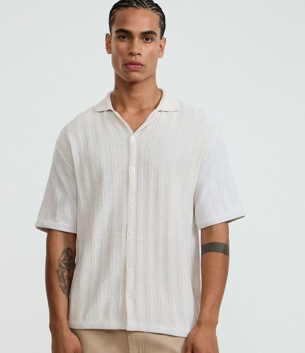 Camisa manga curta em tricot liso com ponto em listras discretas. Possui gola bowling, abotoamento frontal e modelagem boxy. Confeccionada com processo mais sustentável, oferecendo conforto, durabilidade e sum visual moderno e urbano.
