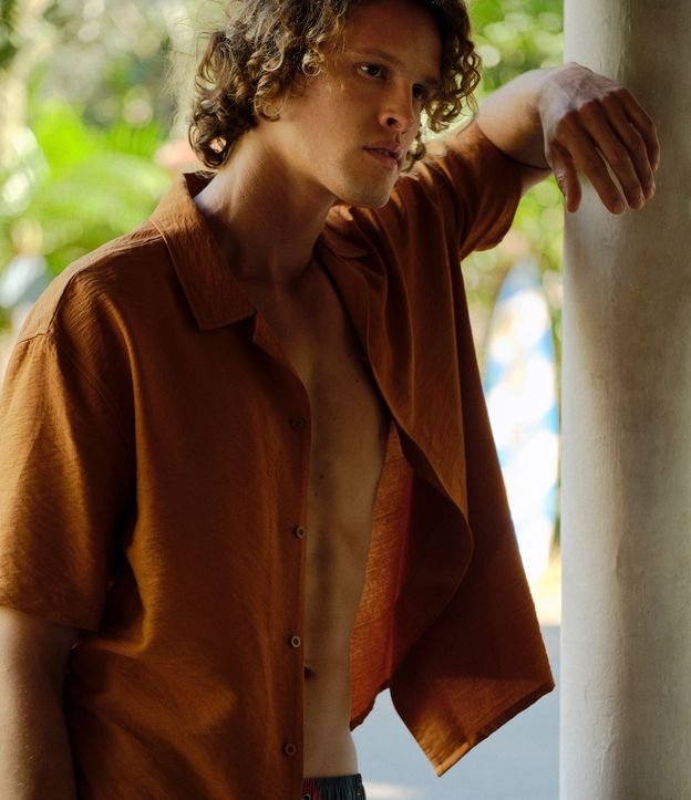 Camisa masculina confeccionada em viscose no modelo boxy, gola colarinho, abotoamento frontal, manga curta e textura.