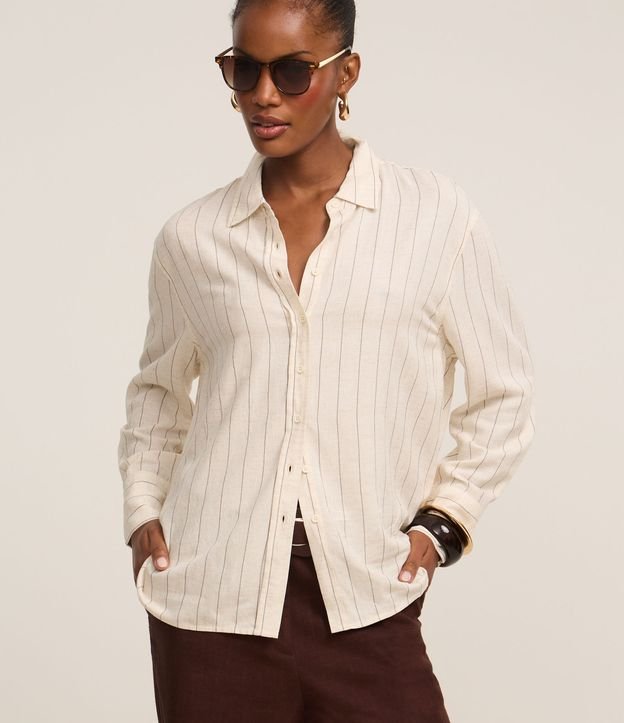 Camisa feminina confeccioanda em viscose e linho, de material mais sustentável. Possui gola camisa, mangas longas com punho ajustado, fechamento por botões e estampa de listras a fio tinto.