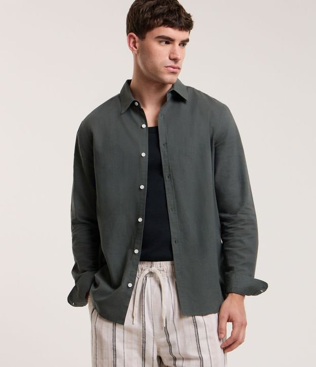 Camisa Comfort Básica em Linho e Algodão Verde Acinzentado