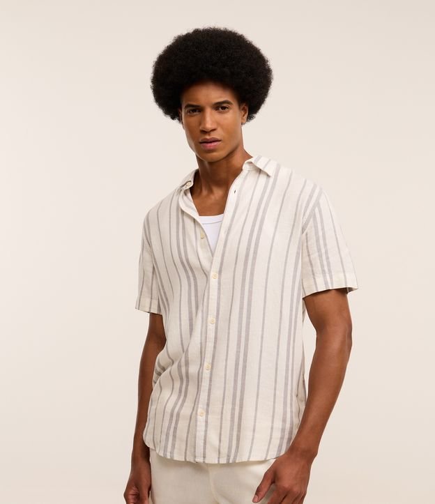 Camisa Comfort em Linho com Estampa Listrada Bege