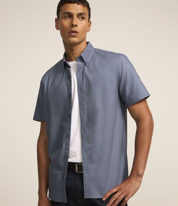 Camisa masculina confeccionada em oxford mais sustentável, gola com lapela, abotoamento frontal e manga curta. Peça no modelo comfort.