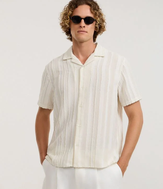 Camisa masculina comfort com textura e listras, gola lapela e abotoamento frontal. Ideal para compor looks casuais com toque moderno. Produzida em tecido sintético leve e resistente.