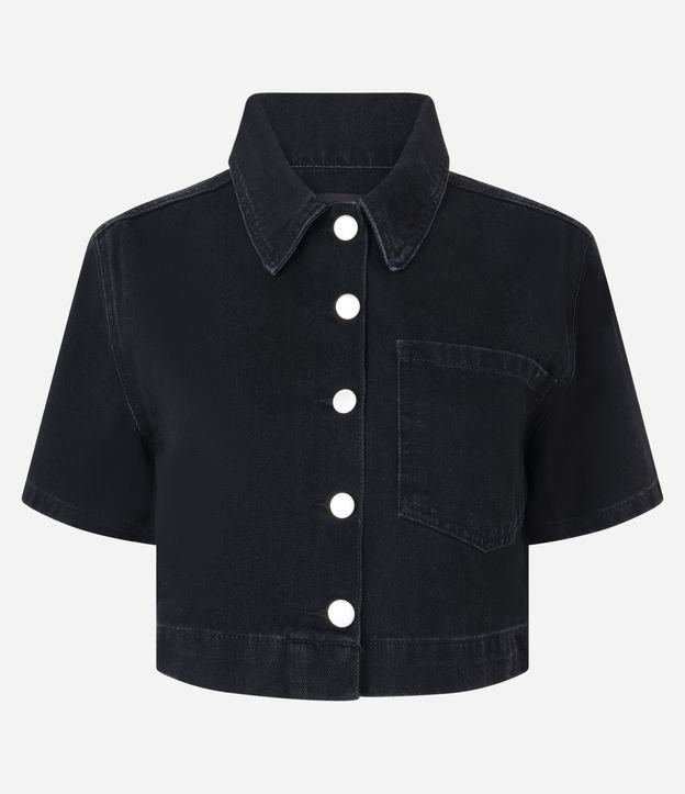 Camisa Cropped em Jeans com Botões e Bolso Preto