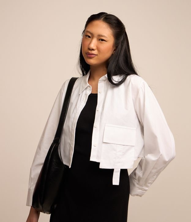 Camisa Cropped em Tricoline Bolso Frontal e Detalhe de Martingale