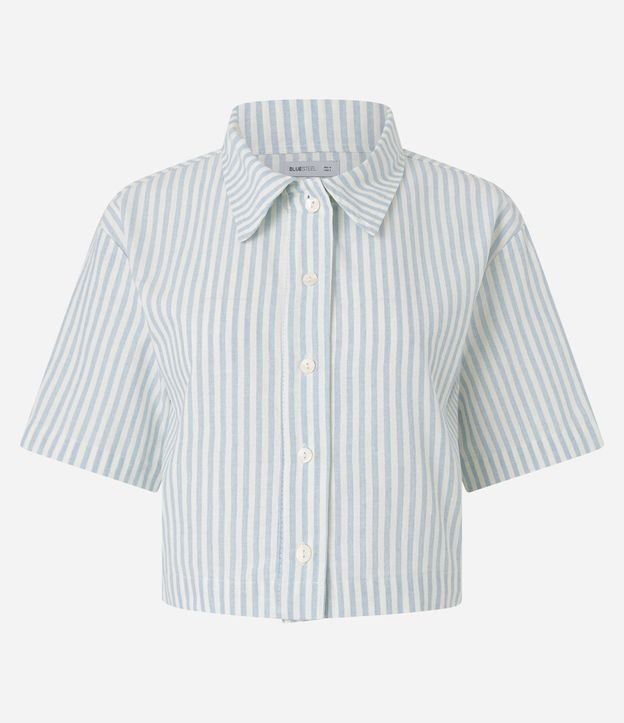 Camiseta curta feminina confeccionada em sarja, com gola tradicional colarinho e mangas curtas. A peça é cropped, possui padronagem de listras e abotoamento frontal.