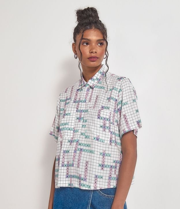 Camisa Cropped Manga Curta Estampa Palavras Cruzadas