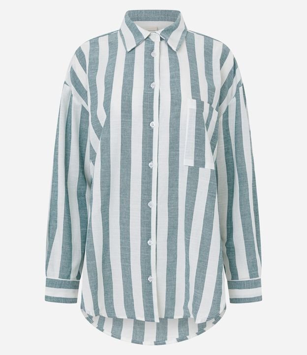 Camisa feminina em algodão certificado BCI, desenvolvido com práticas ambientais responsáveis. O modelo conta com mangas longas, gola polo, abotoamento frontal e nos punhos, bolso no peito e estampa listrada.