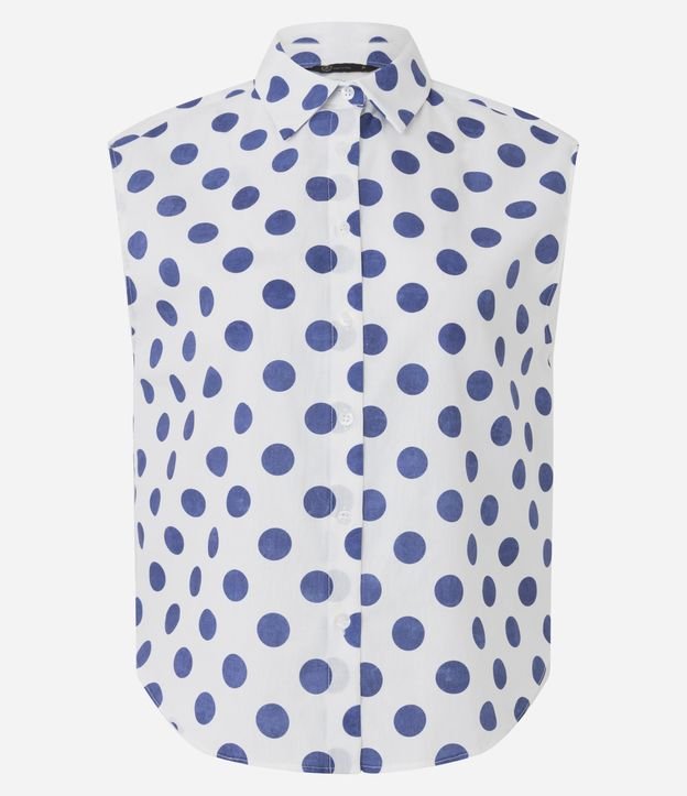 Camisa feminina confeccionada em algodão certificado Bci. Possui modelo sem manga, estampada com poá, modelagem reta, gola padre, fechamento frontal por botões e barra arredondada.