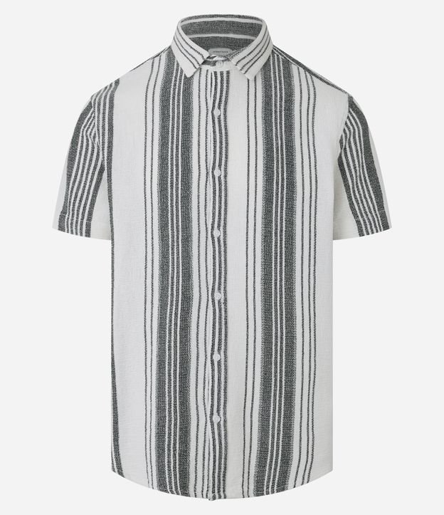 Camisa masculina confeccionada em algodão mais sustentável, gola colarinho, abotoamento frontal, manga curta, textura e estampa listrada sem padronagem.