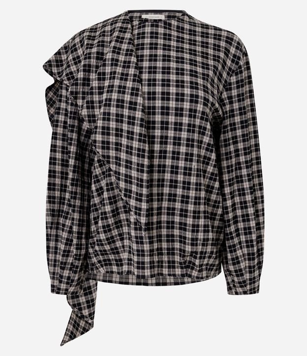 Camisa feminina em anarruga com estampa xadrez, trazendo mangas longas, faixa lateral integrada, que funciona como echarpe e cria movimento.
