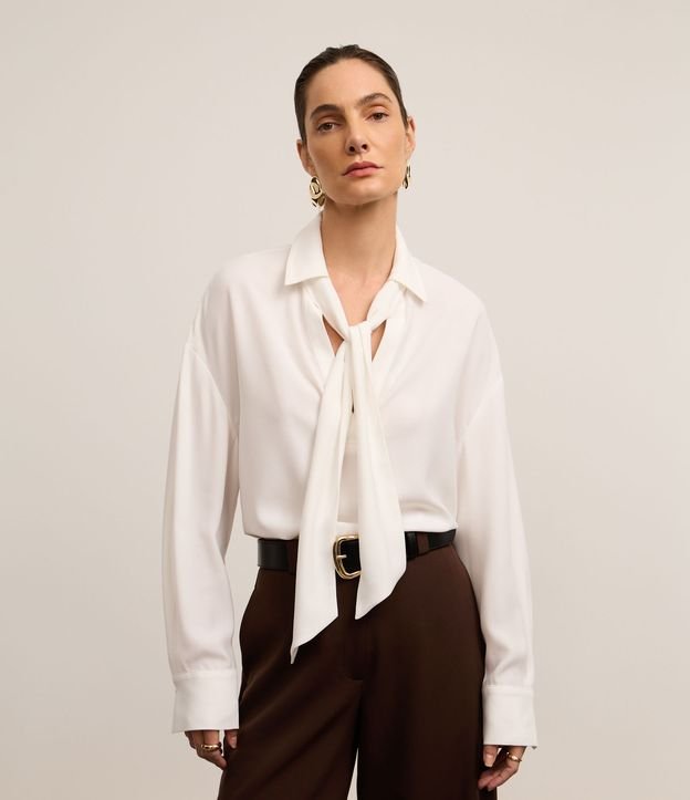 Camisa em Crepe com Gola Laço e Manga Longa Banco Neve