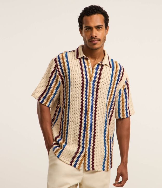 Camisa em Crochê Rustico com Textura e Listras Contrastantes Bege/Azul/Amarelo/Vermelho