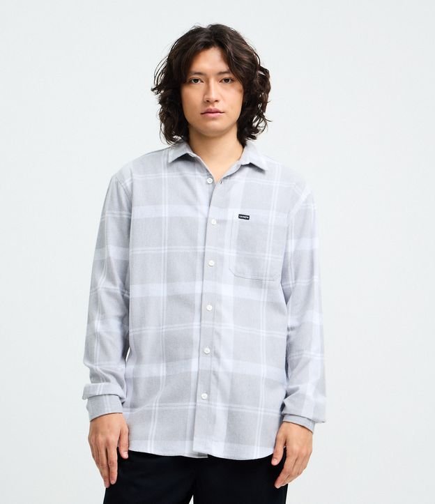 Camiseta manga longa, em flanela xadrez, bolso no peito e abotoamento frontal.