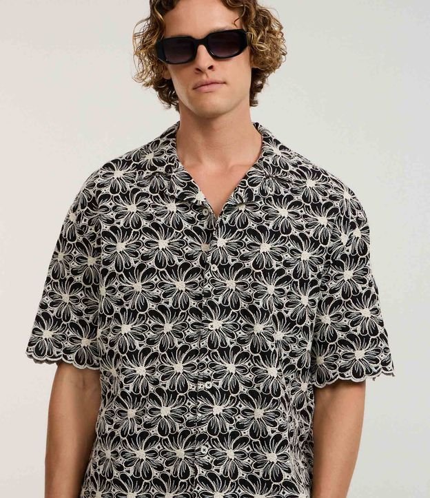 Camisa em Jacquard com Estampa Bordada de Flores Preto