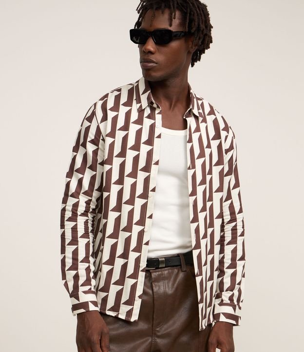 Camisa masculina regular, com gola colarinho, abotoamento frontal, manga longa. Peça com estampa geométrica e confeccionada em material mais sustentável.