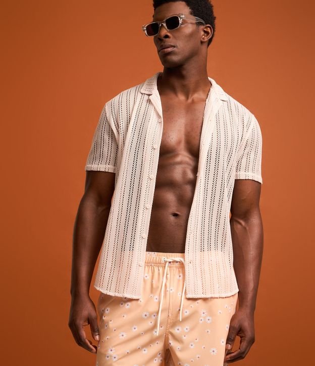 Camisa em Renda com Efeito Crochê Aberto Listrado